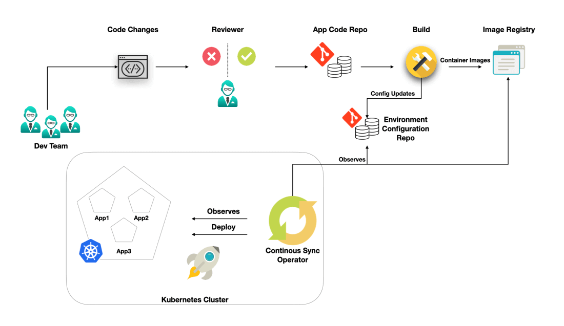 When you push a change to the application repository, the automated pipeline will run unit tests, build a container image and push it into the image registry. After pushing the image, it updates the environment repository. In turn, the “operator” software process that lives inside the cluster will check the operating state of your application, if it finds inconsistent with the state in Git repo, it will be restored to a known state from Git.